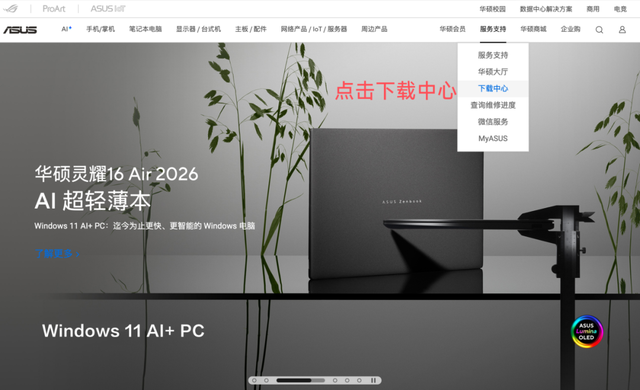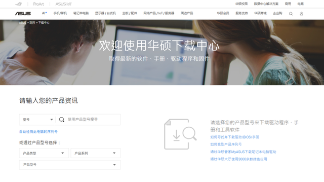 首先,进入华硕官网,在右上角服务支持里面找到下载中心,并且点击。