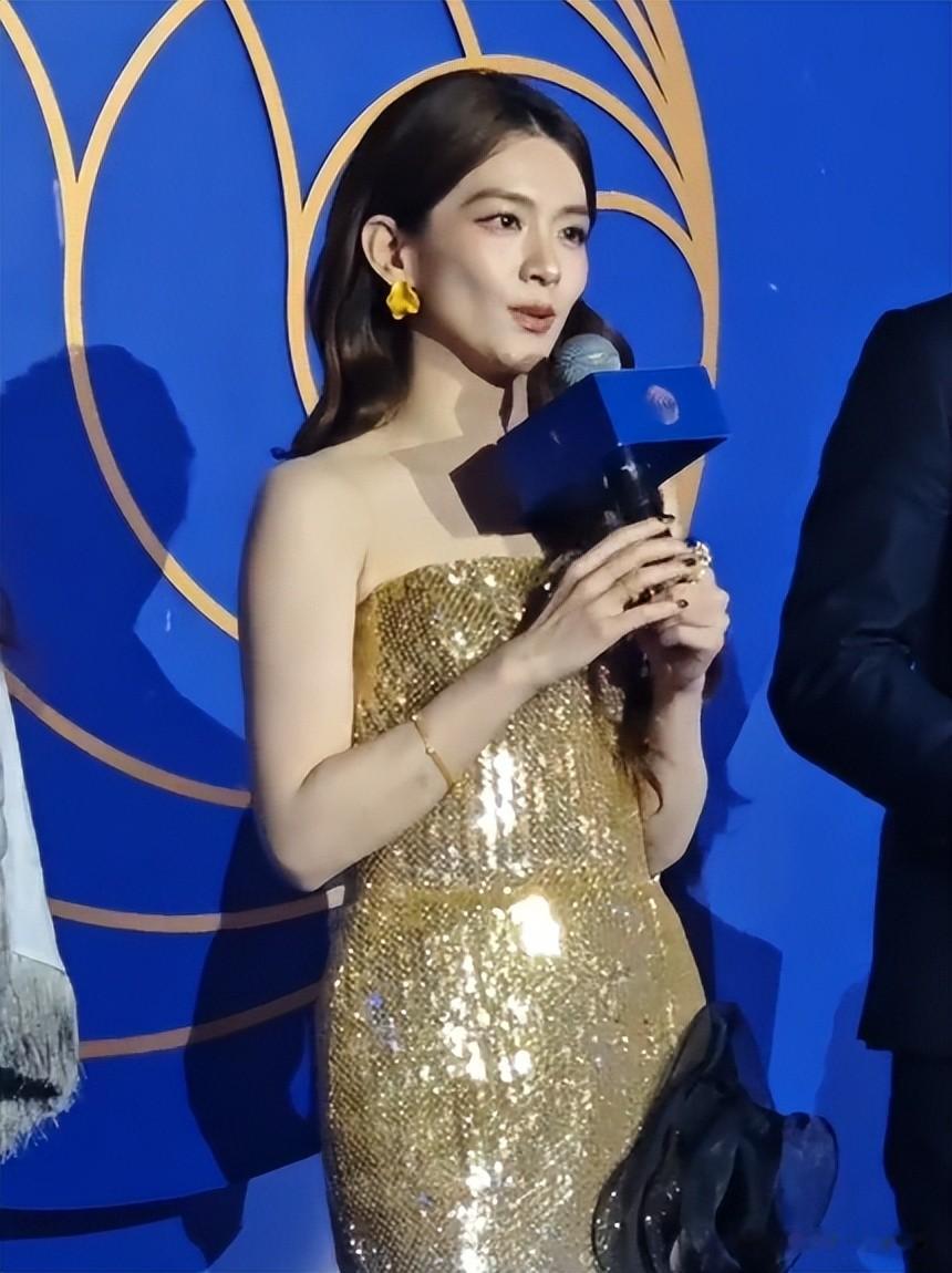 她穿了一金色裹胸鱼尾裙,按理说这种裙子最能凸显身材曲线,但陈昊宇穿出来却像个晾衣架。