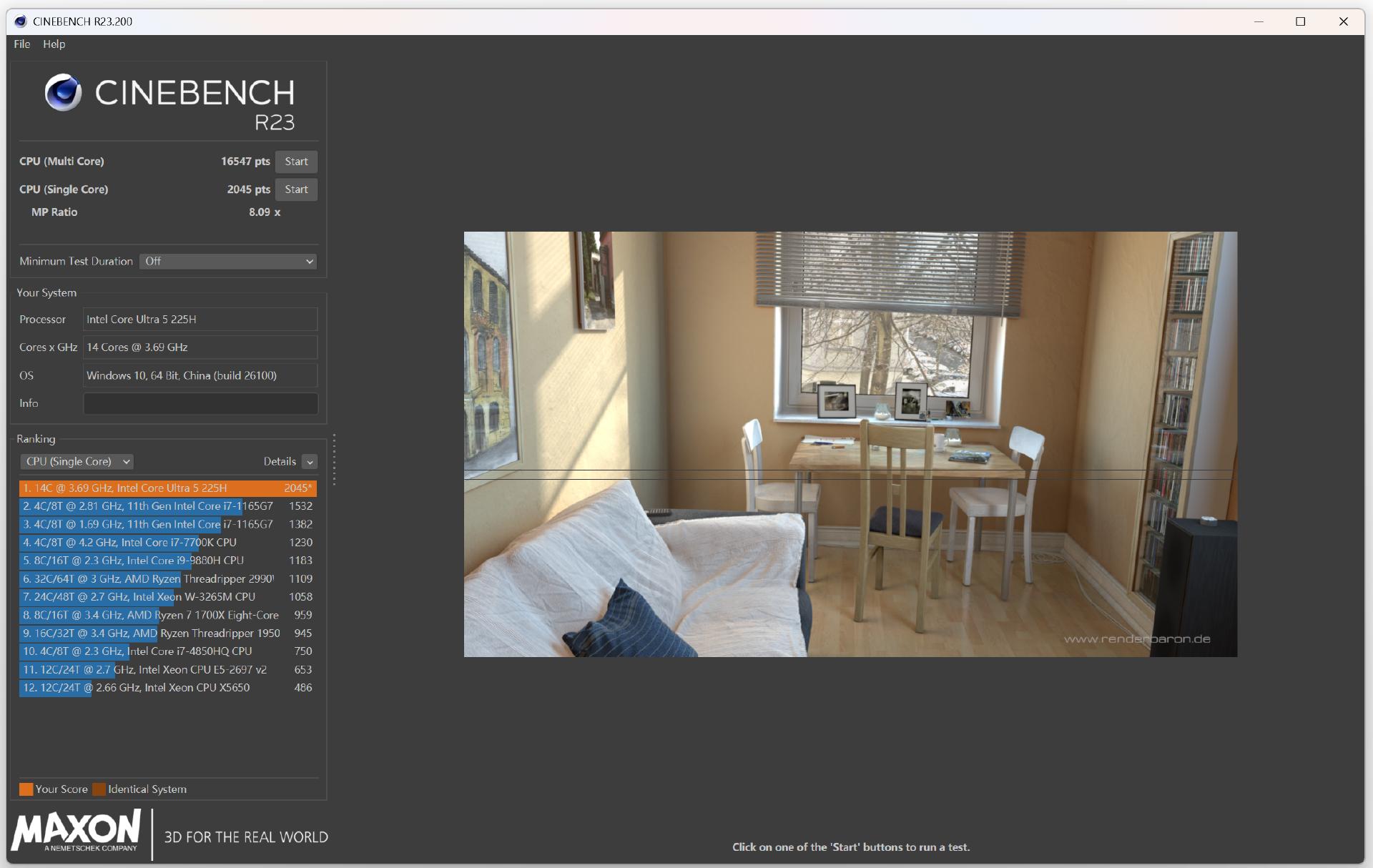 CINEBENCH R23测试,单核成绩为2045pts,多核成绩为16547pts。