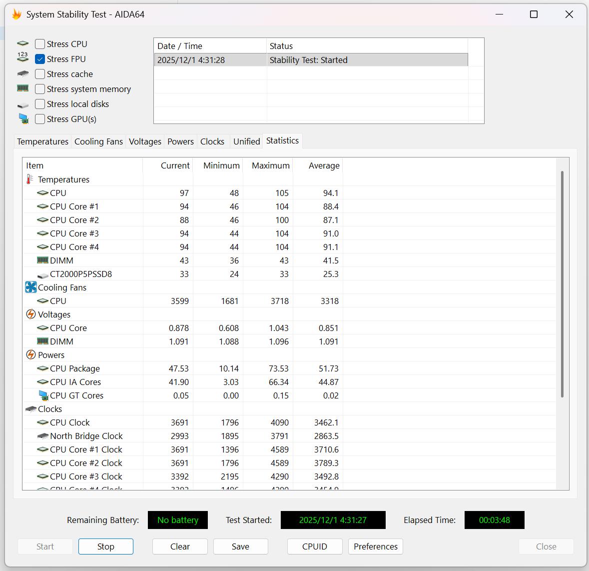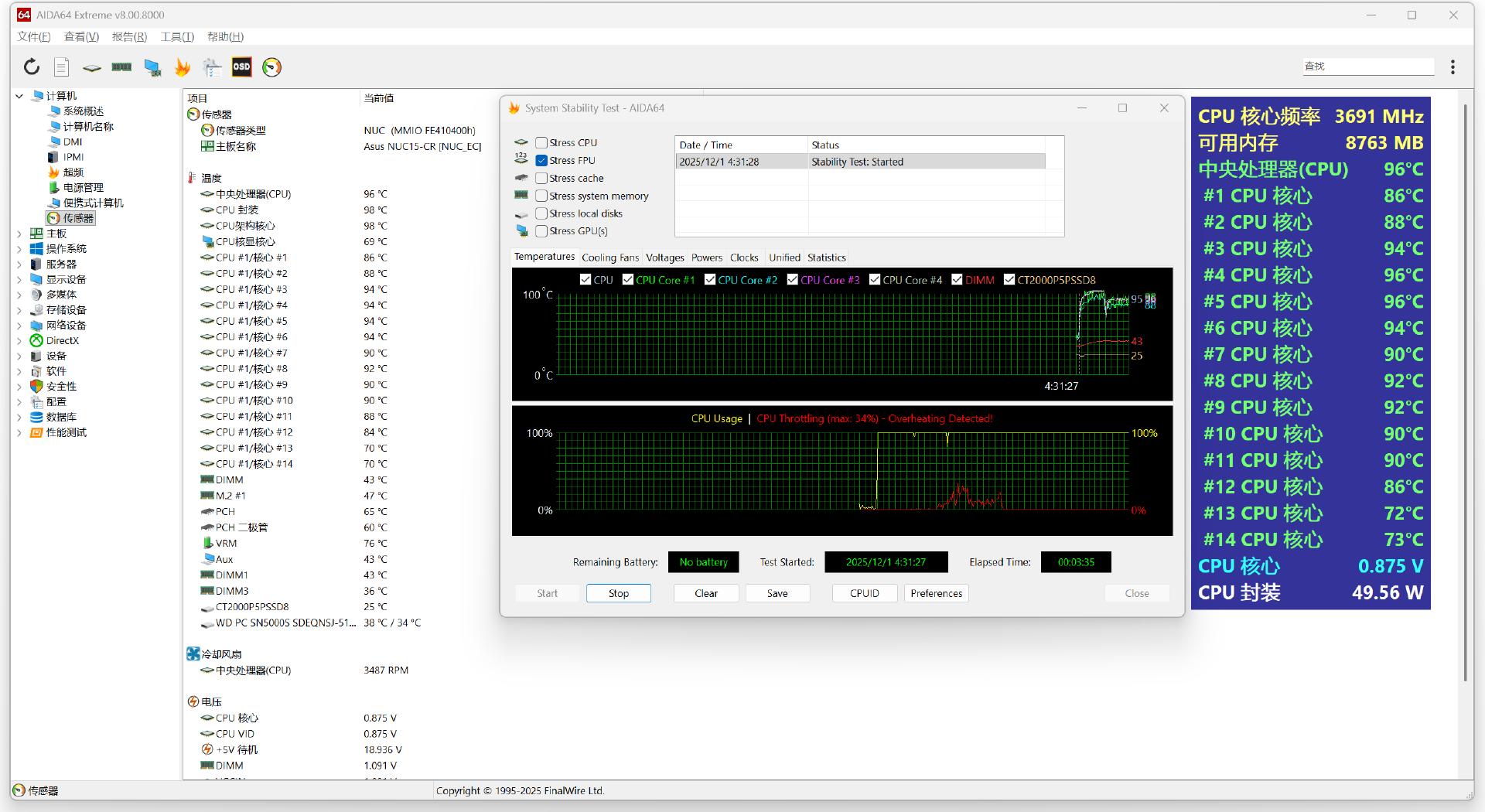 拷机实测,华硕NUC 15 Pro的最大释放功耗能达到75W以上,温度墙为105℃左右,突破后就会降频,性能释放保持在50W左右散热整体表现中规中矩。