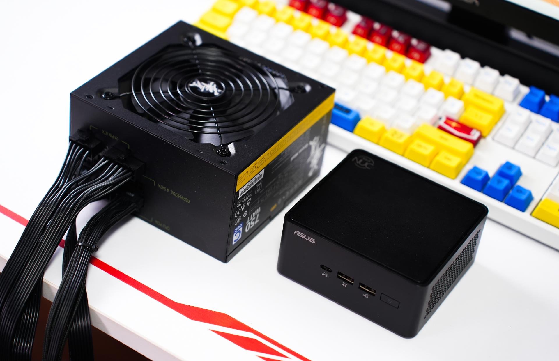 同时,拿出一个标准形态的ATX电源(150 × 140 × 86mm)进行对比,华硕NUC 15 Pro的体型也小上一圈。至于重量,官方的数据显示约为600克,也就是1斤2两,结合小巧的电源适配器,携带也非常方便。