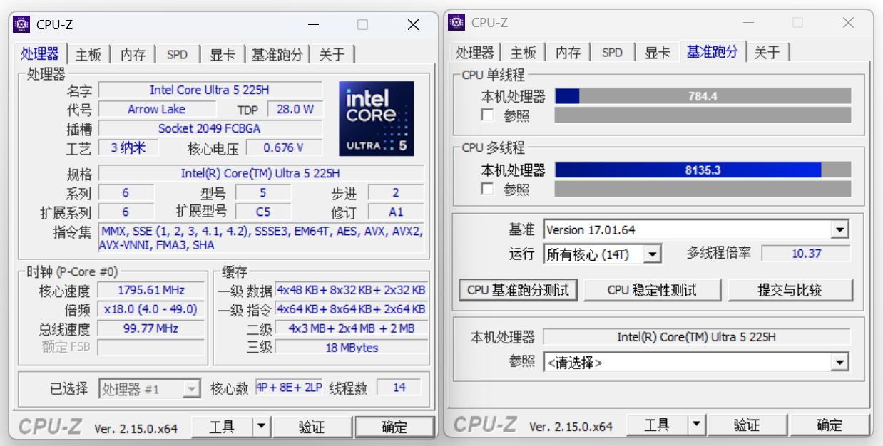 通过CPU-Z可以看到,其搭载的英特尔酷睿Ultra 5 225H处理器为14核心14线程设计,不支持超线程技术。内部包含4个性能核、8个能效核以及2个低功耗核。其中性能核最大睿频为4.9GHz,能效核最大睿频为4.3GHz,低功耗核的最大睿频则为2.5GHz。缓存18MB,TDP为28W。通过测试,单核得分为784.4,多核得分为8135.3。表现还不错。