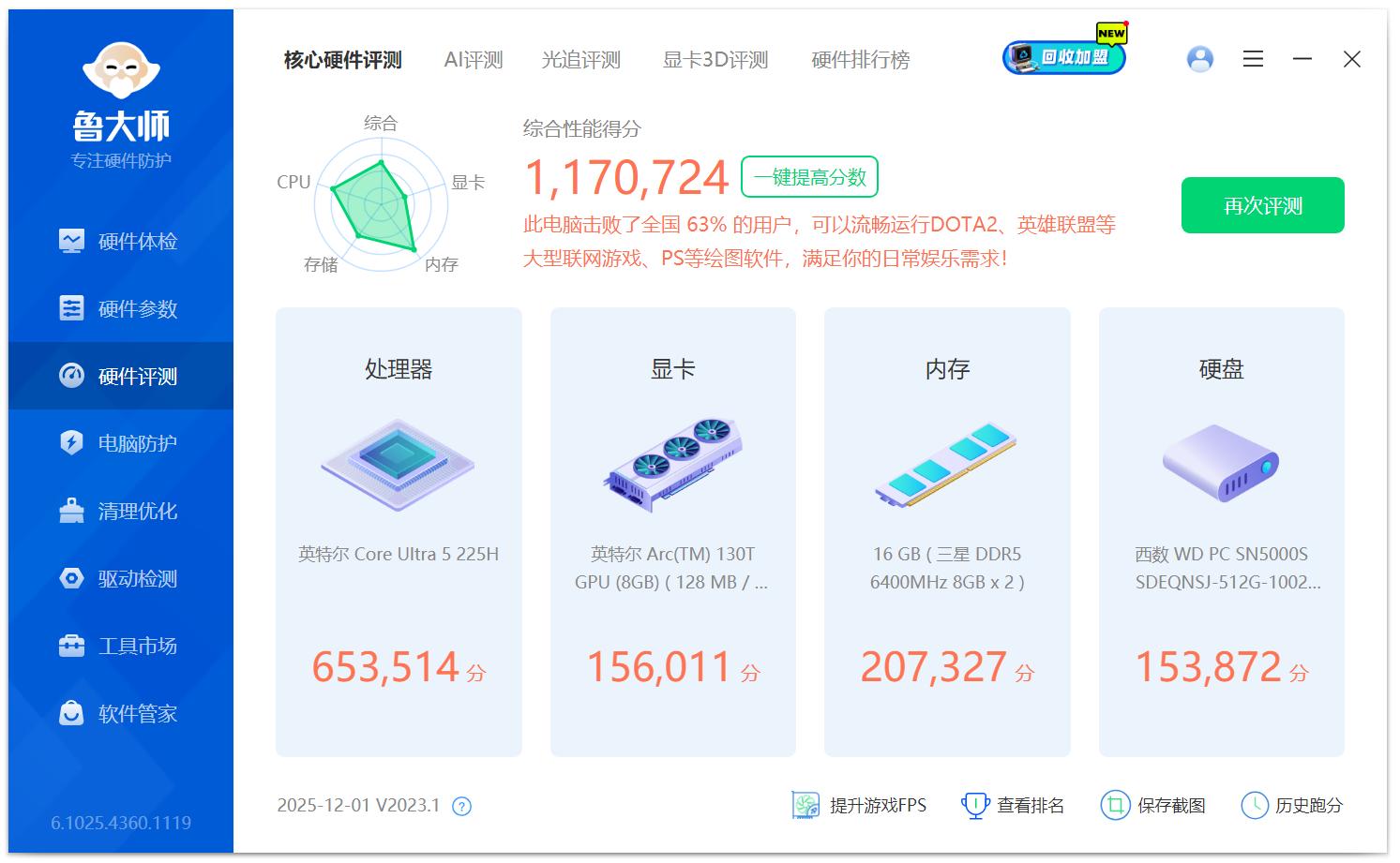 综合性能得分为1170724,其中CPU得分为653514,英特尔 Arc 130T集显得分为156011,内存得分为207327,硬盘得分为153872。