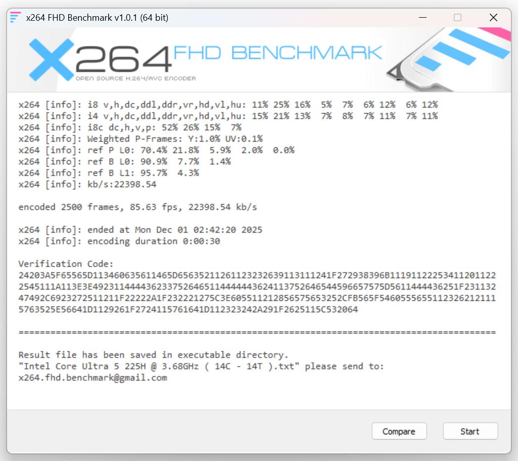 在视频编码方面,通过x264 Benchmark测试可以看到,编码2500帧视频的帧速率达到了85.63fps,速度为22398.54 kb/s,仅用30秒就完成转码。