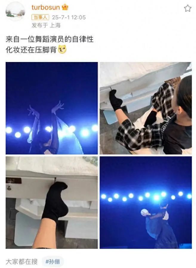 7 月 1 日,孙俪在社交平台上分享了女儿小花参加国标舞比赛的花絮照,并配文称:“来自一位舞蹈演员的自律性,化妆还在压脚背。”照片中,11 岁的小花盘腿坐在椅子上,让化妆师为其化妆造型,而她的脚则抵住桌子反过来练习压脚背,脚背弯曲的弧度让人看了都觉得疼,但她却一脸轻松。