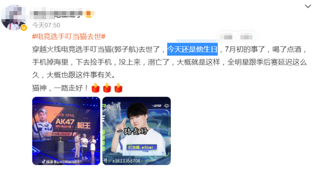 7月25日,电竞圈传来一则令人悲痛的消息,穿越火线电竞选手叮当猫(郭子航),在24日晚喝酒聚餐后,手机意外掉落海中,带着醉意去海中捞手机,坠溺亡在青岛的海域当中,享年21岁。
