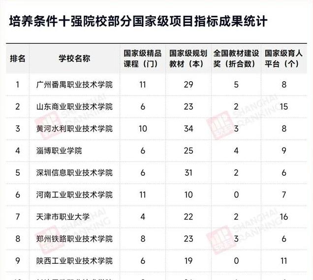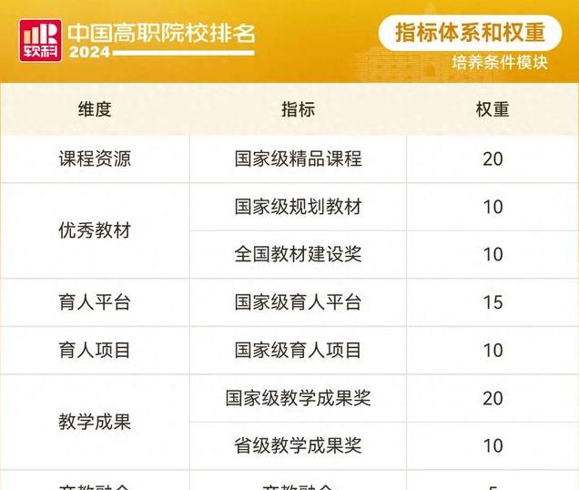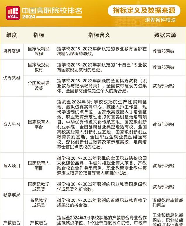 培养条件排名包含课程资源、优秀教材、育人平台、育人项目、教学成果和产教融合6个维度,涵盖8个指标。