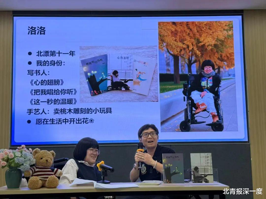 见面的那天,魏玲看到坐在轮椅上的洛洛。瘦瘦小小一个,缩在轮椅里,一张圆脸上有孩童的天真,也有生活艰辛的痕迹。她和同事来南锣鼓巷陪洛洛卖书。在洛洛的轮椅前,挂着一块牌子,上面印着“我写的书”。魏玲记得那天很冷,三个人在巷子里待了三四个小时,最终卖出了30本书。“这对我来讲也是第一次经历,我们还拿了一张纸,写上大冰推荐,在路边吆喝,当时腿都冻麻了。”