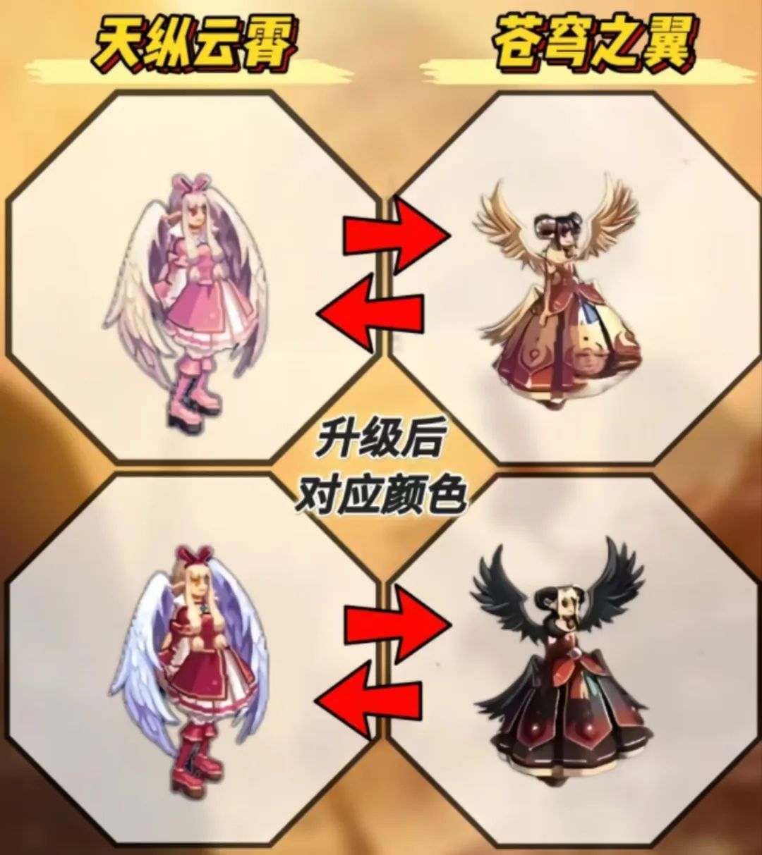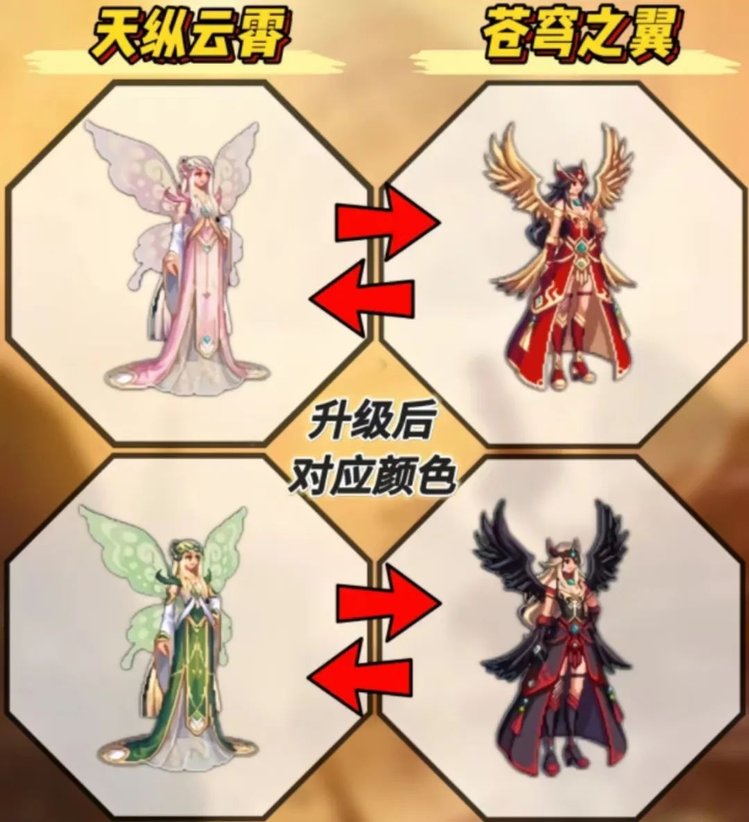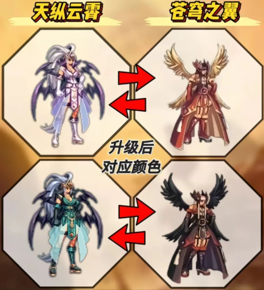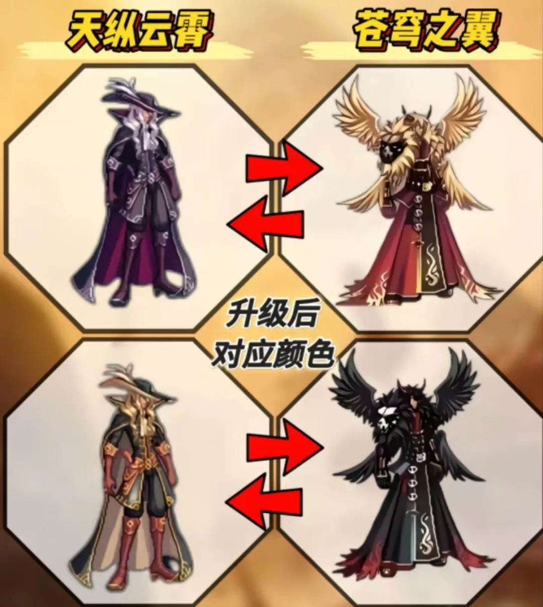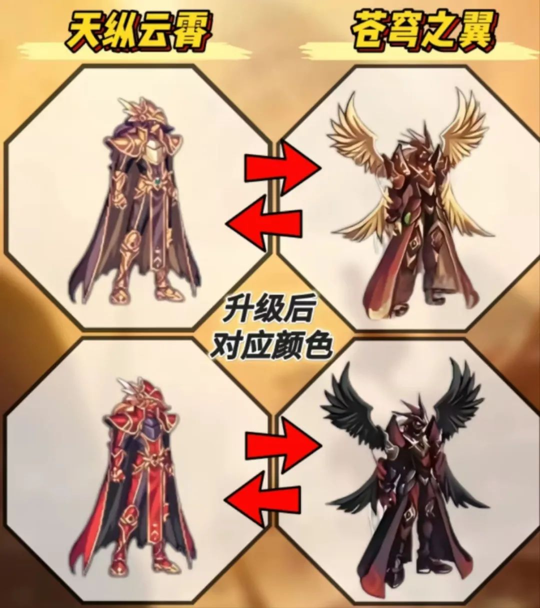 首先是升级。官方之前提到了天3只能通过2天进行升级,并不能用天1升级,此外除了升级的途径之前,也可以通过合成的方式。不过升级具有100%成功率,所材料和天1升级天2一样,一件高级时装和一个装备合成器即可。这里给大家看一下升级对应的颜色,具体如上图。