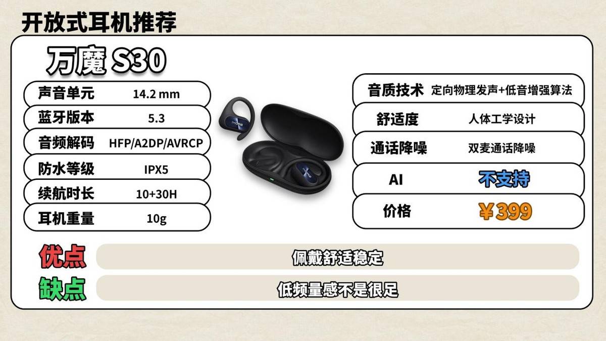 该耳机搭载定向发声单元,可在靠近耳朵的位置将声音准确导入耳内,即便在喧闹场合也能保持良好的聆听效果,并显著降低声音外漏。音质表现上,万魔S30配备14.2mm类钻石振膜动圈单元,并辅以低频增强算法,带来更加深沉有力的低音效果,使整体听感更富层次与饱满度。