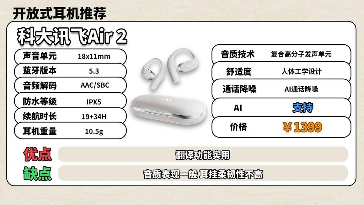 功能配置上,Air2具备IPX5级防水,可应对汗液与小规模溅水。续航方面,单次充电可使用19小时,总续航达34小时,且支持快充,充电10分钟即可使用约2小时。此外,它采用蓝牙5.3技术确保连接稳定,支持佩戴检测与三台设备记忆。内置麦克风阵列配合专属App,能实现高准确度语音转写,并支持8种语言的双向翻译,延迟控制在1.5秒内。这些功能对日常娱乐用户可能略显丰富,更适合商务办公场景的应用需求。