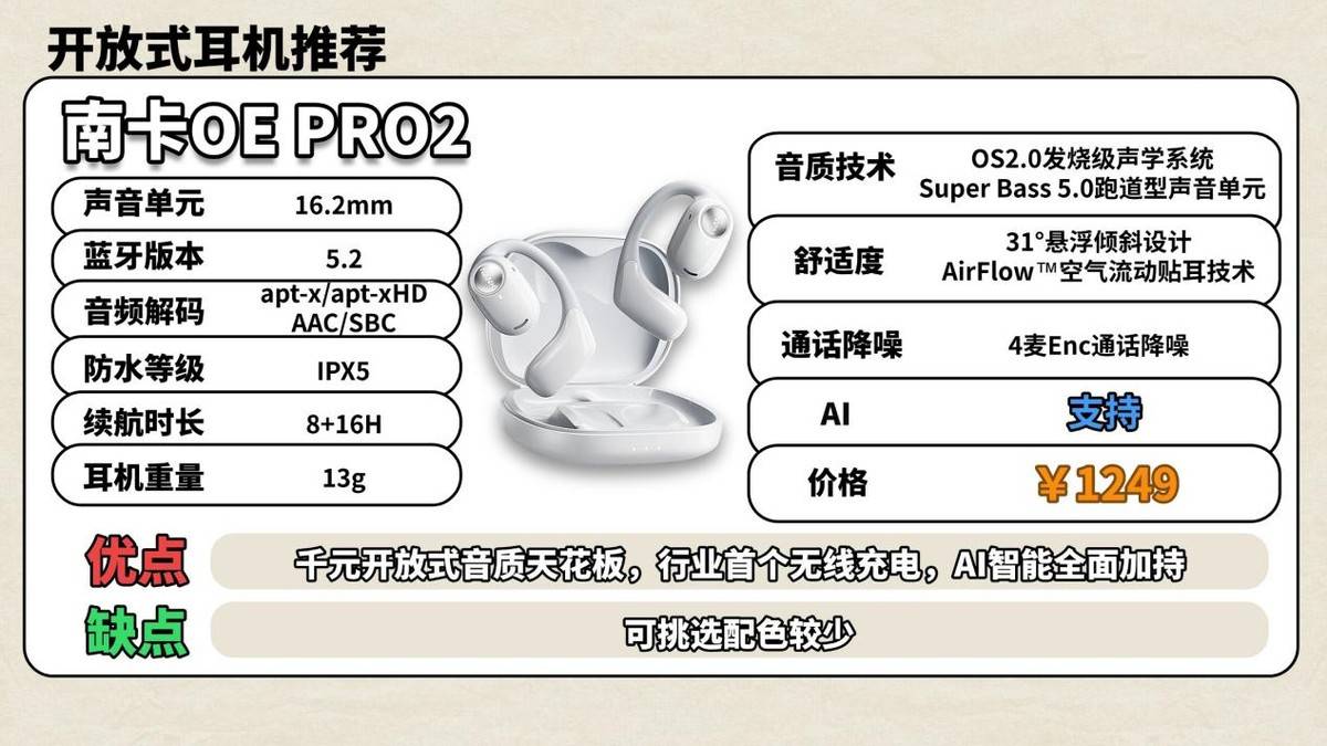 作为开放式耳机领域的早期开拓者与长期耕耘者,南卡在开放声学技术领域已持续钻研超过十三年,凭借坚实的产品力成为行业标杆之一。其代表作OE Pro2,融合AI智能系统、零压迫佩戴体验、旗舰级声学硬件与深厚的音质调校技术,始终位于开放式耳机市场的领先阵营。
