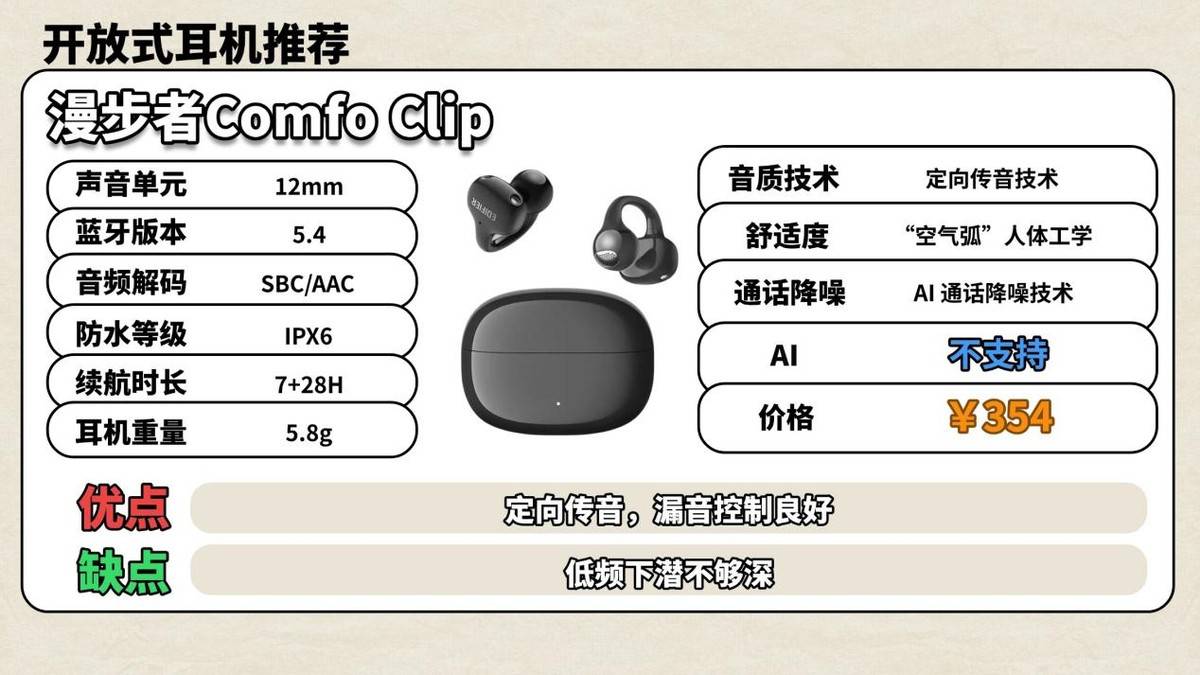 在平价耳机领域,漫步者Comfo Clip无疑是一款表现突出的潜力机型。它创新地将半入耳式的舒适感与耳夹式的稳固性相结合,突破了传统形态限制,佩戴轻盈无压力,即使在跑步、跳绳等剧烈运动中,也能紧密贴合耳廓不松动。