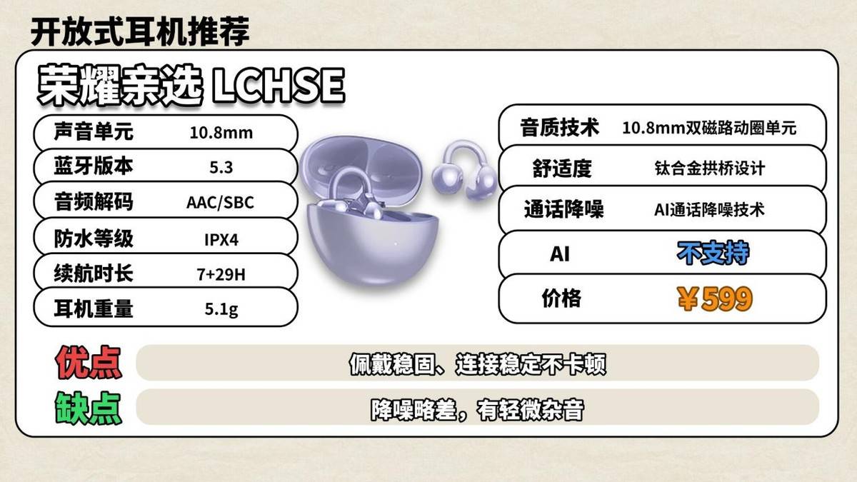 荣耀在智能穿戴领域持续探索,荣耀LCHSE耳机即是其精心研发的代表作。耳机采用钛合金拱桥形态,设计概念源于中国古典石拱桥,融合了科技感与传统美学。机身关键结构使用高性能钛合金材料,结合耐磨耐蚀的PC外壳,在确保结构强度的同时实现了轻量化,单耳重量仅5.1克。