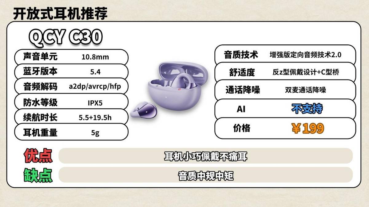 在国内入门级耳夹式耳机评测领域中,QCY C30以其独具辨识度的外观与舒适的佩戴感受收获广泛好评,同时其通过了行业品质认证,也赢得了注重个性与性价比的年轻用户青睐。这款产品以实惠的定价融合了特色设计与实用体验,成功成为入门市场中的热门选择,实现了销量与口碑的双重突破。