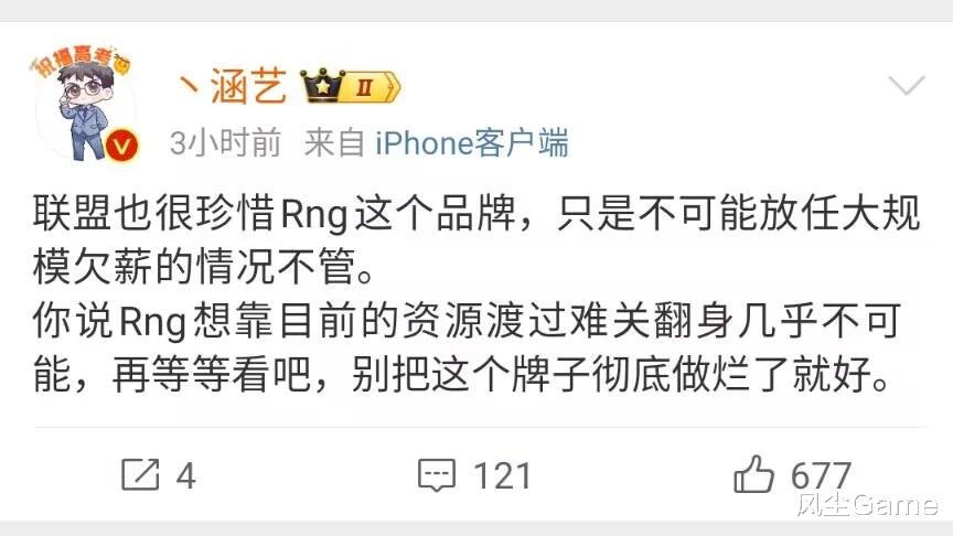 朱开的原话如下:RNG现在正在补款,官方给的最后期限是18号,如果还完欠款,RNG可以正常比赛,要是无法结清的话,第一赛段德玛西亚杯,可能就没法参赛了,涵艺也发文透露:LPL官方,很珍惜RNG这个品牌,但大规模欠薪又不能不管,但以RNG现在的资源,几乎不可能翻身。