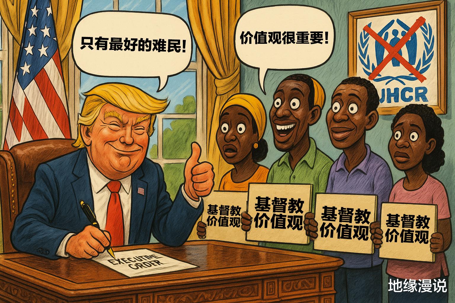 特朗普凭借“种族歧视”为理由,跳过了联he国难民署的标准审查流程,迅速地通过了非洲人的难民申请。这一举动体现了其“依据价值观择优录取”的难民策略。此行为被看作是对传统难民接收的挑战,与此同时也反映出美国在种族及移mim议题上的分歧立场。