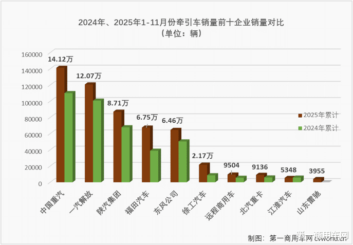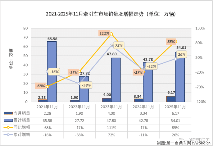 2025年11月份,重卡市场整体销量同比实现65%的增长,牵引车市场同比增长85%,连续三个月跑赢重卡市场“大盘”;今年1-11月,重卡累计销量同比增长27%,牵引车市场目前26%的累计增幅比重卡市场整体增速还低1个百分点。2025年最后1个月,牵引车市场能否反超?这将是12月份牵引车市场的一大看点,请关注本站后续报道。
