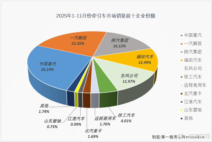 与2024年年终格局相比,2025年1-11月牵引车行业前十成员和座次均发生了变化:去年牵引车排位赛还“查无此人”的山东雷驰,目前暂列行业第10位;去年年终排名第10的远程商用车,11月过后暂列行业第7;去年年终排名第5位的福田今年11月过后暂列行业第4;去年年终排名第7位的徐工上升一位,暂列行业第6。“你进我退”中也有企业排名出现下滑,甚至被挤出前十,2025年仅剩最后1个月,留给落后企业的机会已经非常少了。