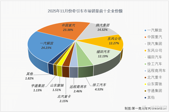 从行业格局看,与上月相比,2025年11月份牵引车市场行业前十成员保持不变,排名变化如下:东风与福田换位,东风上升一位至月榜第4位;远程与北汽重卡换位,远程上升一位至月榜第7位;排名月榜前3位的解放、重汽、陕汽,排名第6位的徐工,以及排名第9、10位的山东雷驰和宇通保持10月份排名不变。