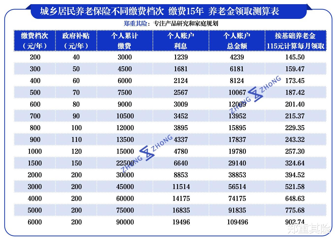 城乡居民养老金共有15个缴费档次,分别对应了11档财政补贴,财政每年最高补贴200元。