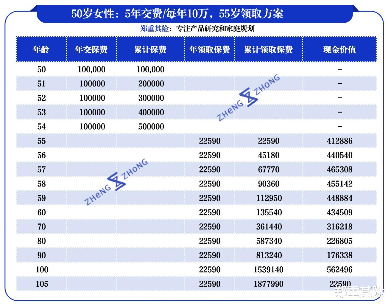 按照每年10万块,交5年的方式,只要55岁一到,张妈妈就能开始领养老金。