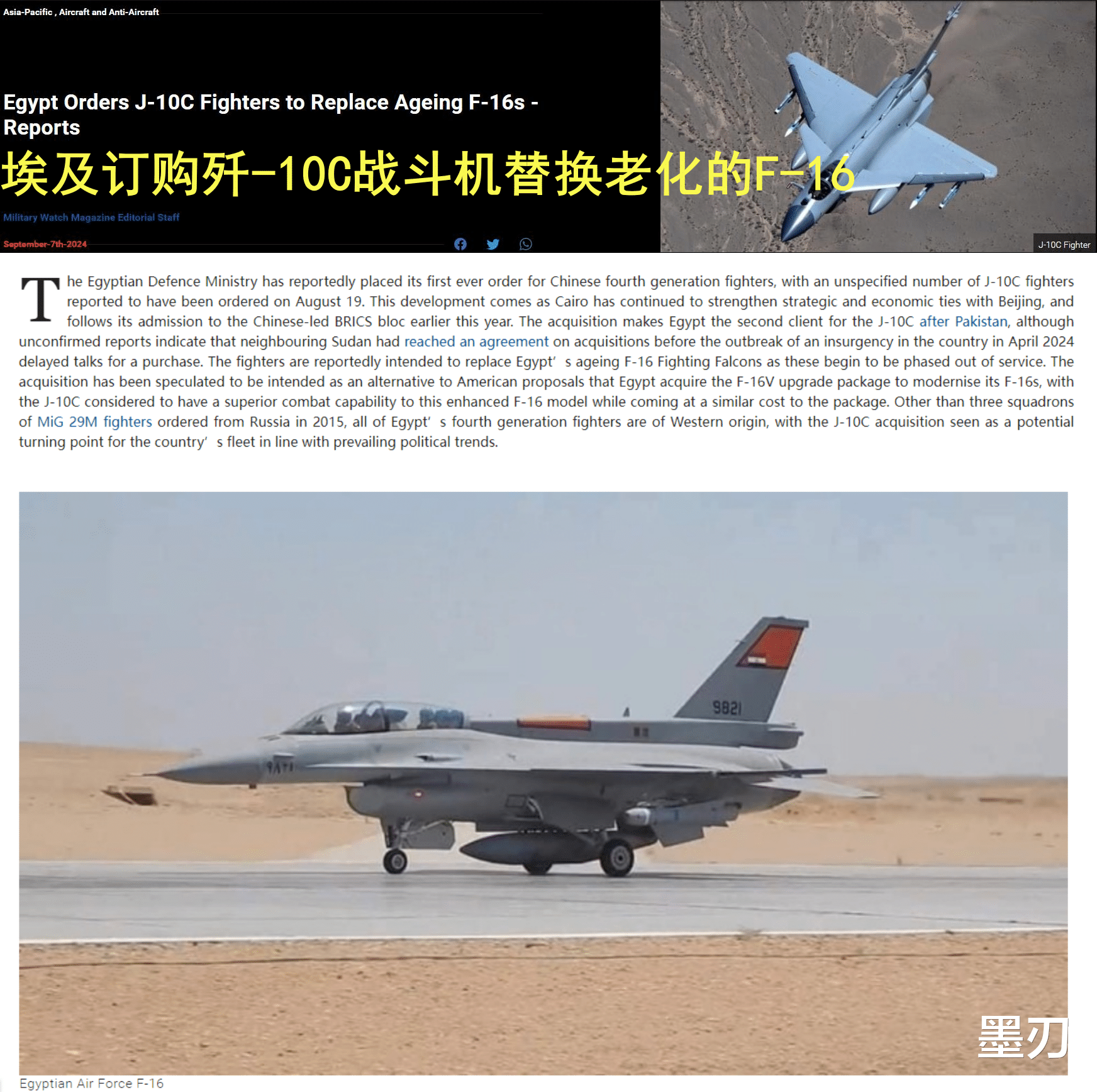 此单交易一旦完成,埃及就成为了我大歼-10战斗机的第二个国际买家,可喜可贺。