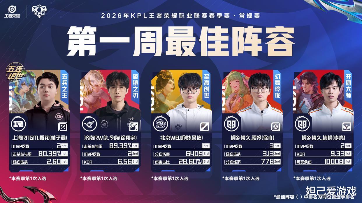 KPL官方公布了春季赛第一周的最佳选手名单,本周的周最佳很有意思,来自KGL赛区的桐乡情久战队共有两名选手上榜,分别是发育路选手陌冷、游走位选手楠枫,除了有两名选手登上周最佳外,这支队伍的净胜分也排在全联盟第一的位置。
