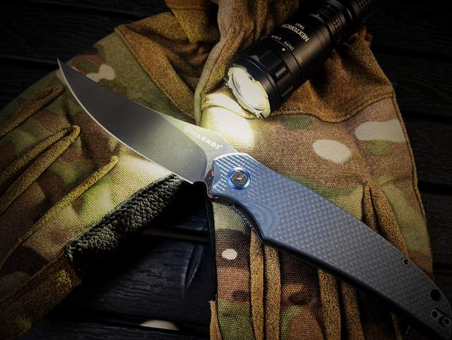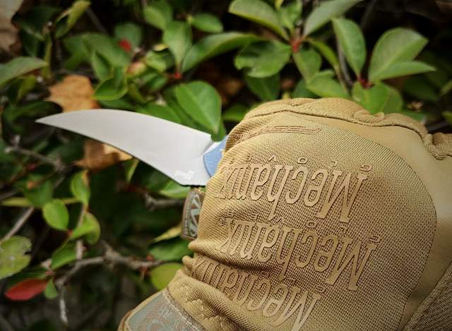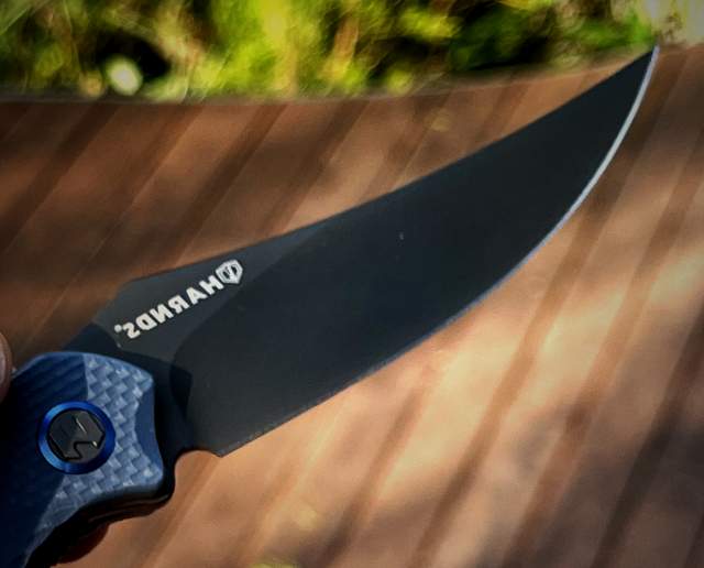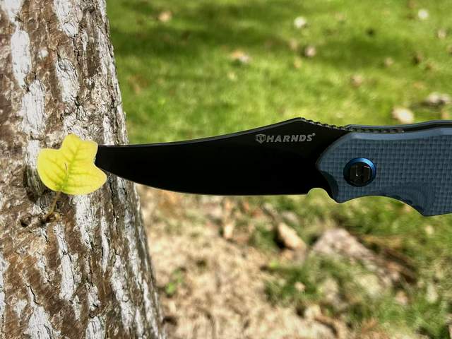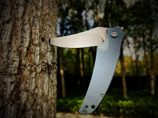 刀刃造型独特,采用的是上翘型矛尖造型,穿刺能力极强。同时,因为刀尖的上翘,刀刃弧度更大,从而产生更强的削切和劈砍能力。