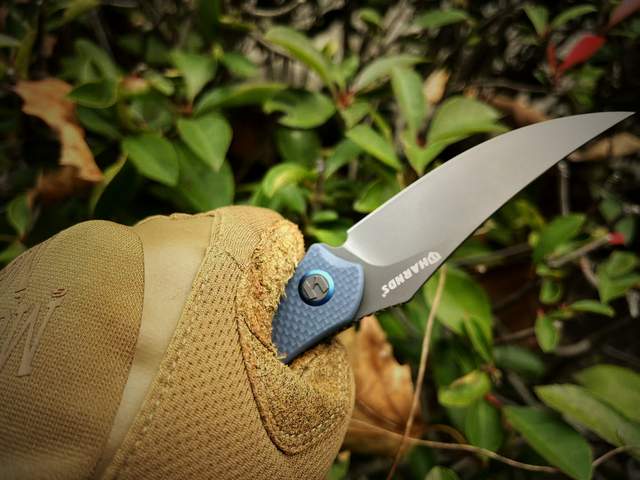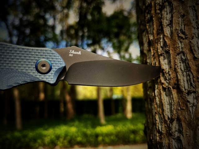 悍迪鲨鱼的快开结构设计的很独特,有别于一般折刀的背部快开鳍,鲨鱼的快开鳍在刀柄前侧,挺像独角鲸的角;
