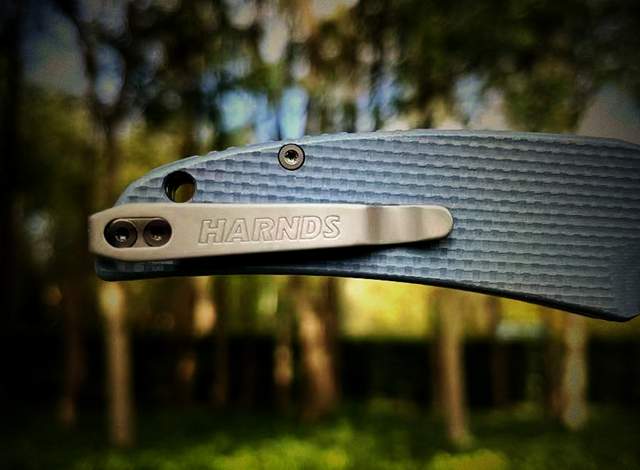 刀柄背部配有穿绳孔,可以安装上伞绳,便于携带。同时,凹刻着HAENDS logo的背夹,也非常实用。