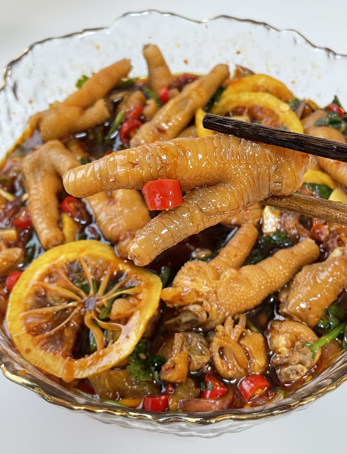当时光流转,再次打开冰箱,取出那盒浸满酱汁的鸡爪,你会发现它们已经发生了奇妙的变化。原本白皙的鸡爪此刻呈现出诱人的酱色,柠檬的清香已经完全渗透进了胶质里。夹起一块放入口中,那酸、辣、鲜、香在口腔中瞬间炸裂,鸡爪的脆爽与柠檬的清新完美融合,没有丝毫油腻之感。这柠檬鸡爪真的巨好啃,每一口都是对味蕾的极致挑逗,让人在炎炎夏日里也能胃口大开,沉醉在这份酸辣清爽的人间至味中。