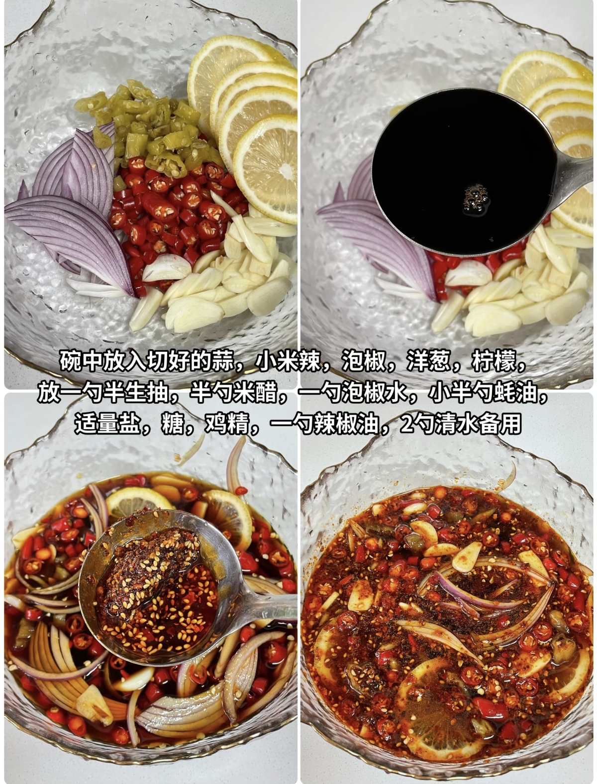 趁着鸡爪在冰水中享受“冷疗”的时候,我们可以来调制这道菜的灵魂酱汁。取一个大碗,放入大量的蒜末和切好的小米辣,淋上一勺热油激发出香味,这是中式凉拌菜的精髓所在。随后,加入生抽、陈醋、少许老抽上色、一点蚝油提鲜,再根据个人口味加入适量的盐和白糖。此时,将柠檬切成薄片,一定要记得剔除柠檬籽,因为柠檬籽在浸泡久了之后会释放出苦味,破坏整盘菜的鲜美。将柠檬片和切好的洋葱丝、香菜段一同放入酱汁中,搅拌均匀,一股清新的酸辣香气便扑面而来。