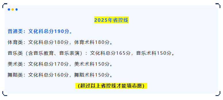 考生的分数要达到最低控制分数线(省控线)才有资格填报志愿,如果达不到则需要等待补录。如2025年的填报分数参考:普通类考生190才能填报志愿,低于190分的同学就只能等补录了!
