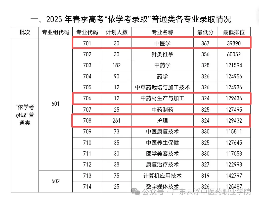 同一个院校专业组的不同专业,录取分数差别也可以很大。比如广东云浮中医药职业学院的中医学专业,最低录取分数要367分。而中药材生产与加工、护理专业只要324分,相差43分!