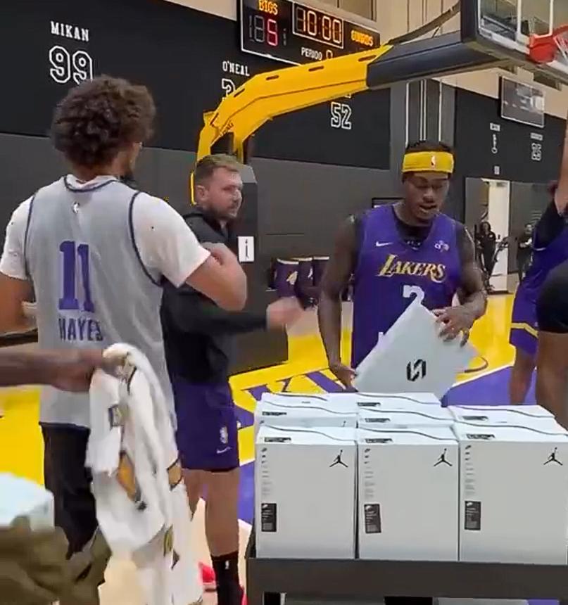 今日,湖人官方更新了社交媒体,晒出了一段湖人球星卢卡东契奇在球队训练结束后为队友们发放福利的视频。在视频中,东契奇向每位球员发放了自己最新款的签名球鞋(每双鞋都按照队友实际穿的码数进行定制分发),不少球员在收到球鞋后都难掩兴奋、直接上脚感受。其中,克内克特和一位训练营合同的球员更是直言这是他们穿过最好的球鞋。