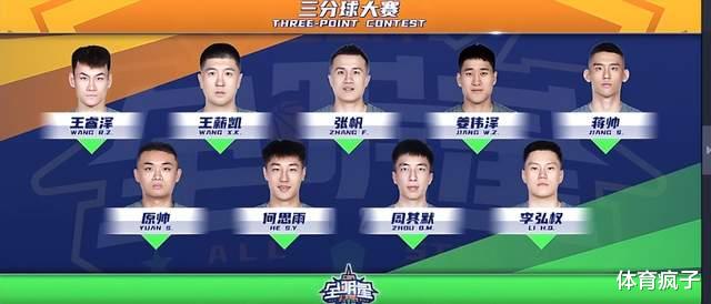 王睿泽第一个出场,两个点拿到9分,花球表现也不错,最终拿到了22分。第二个出场的王薪凯投射速度有些慢,最终投进了18分。第三个出场的是张帆,张帆状态不佳,仅仅得到了15分。第四位出场的姜伟泽,国家队级别的射手,不过姜伟泽发挥的是中规中矩19分。第五个出场的是宁波队投手蒋帅,将帅的投射发挥不佳,看得出来他很紧张,仅仅得到了13分。第六位出场的是山西队的射手原帅,他被寄予厚望,而原帅的发挥也是不错,他拿到了23分。第七位的是天津队的球员何思雨,何思雨前两点发挥不佳,但是后程发力,最终拿到了18分。第八位出场的是CUBA球员周其默,虽然不是职业球员,但是拿到了21分,发挥十分出色。压轴出场的是李宏权,他是外卡选手,但是仅仅拿到了13分。
