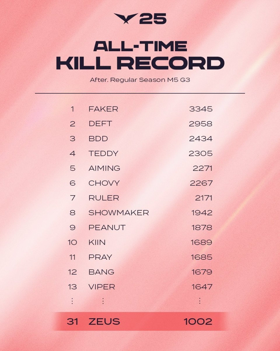 在这场HLE以2-1击败KT的BO3当中,上单Zeus的表现非常出色,他也拿下了这场系列赛的POG!在上一场打GEN的时候,他的竞技状态也不是特别好,尤其是在团战过程里,打的太着急反而一直给到对手机会!而在这场对阵KT的比赛里,基本都是他的个人秀,尤其是决胜局的武器,七进七出成为了对手的噩梦!同时他也达成了自己在LCK的生涯里程碑,拿到了1000次击杀(上一场打GEN的时候就只差几个了),他也来到了上单的第五位,目前上单第一的是Kiin1689次、第二的是Smeb1340次、第三的是Rascal1320次、第四的是Doran1318次。
