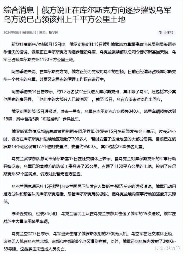 综合报道|俄罗斯方面透露,正在库尔斯克地区慢慢打击乌克兰军队,而乌克兰方面则表示,他们已经占据了该州超过上千平方公里的地域。