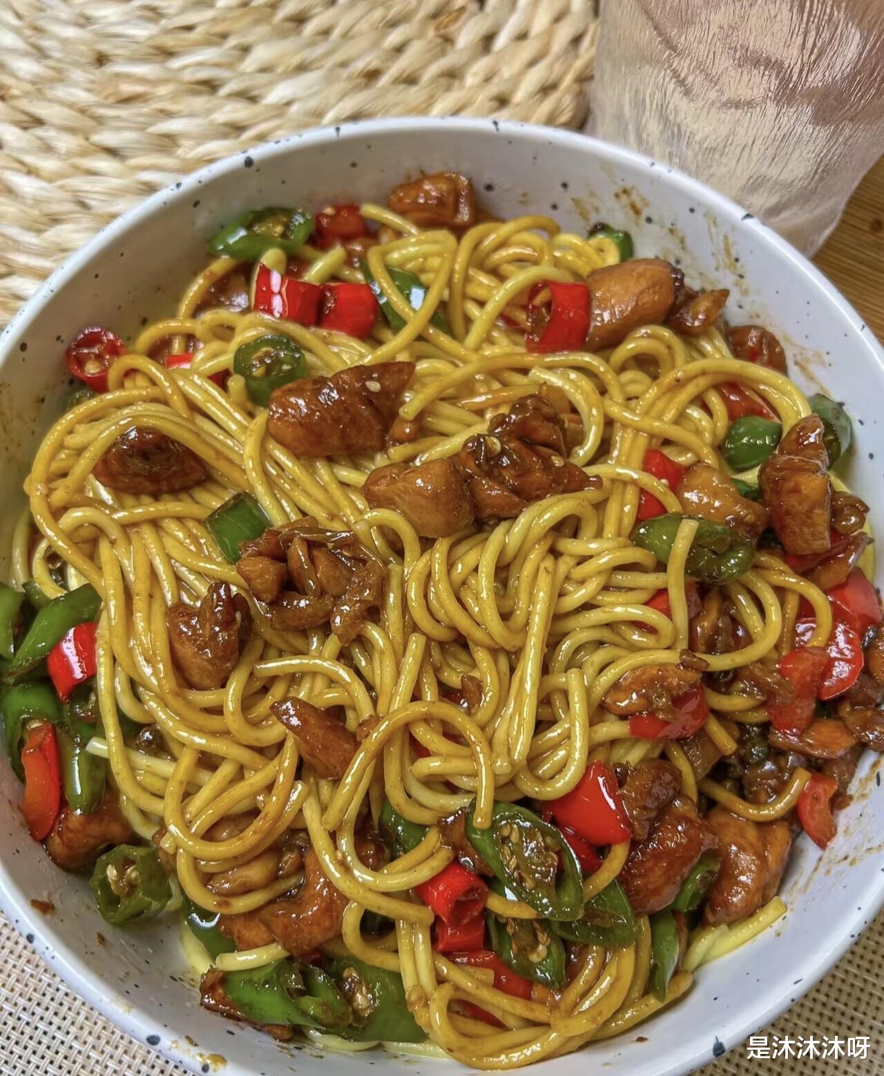 把沥干水的面条盛进大碗里,然后把锅里那锅红红绿绿、香气扑鼻的双椒鸡丁连同汤汁一起,豪迈地浇在面条上。拿起筷子,从底下往上,彻底地翻拌均匀。让每一根面条都吸饱了酱汁,都裹满了肉香。