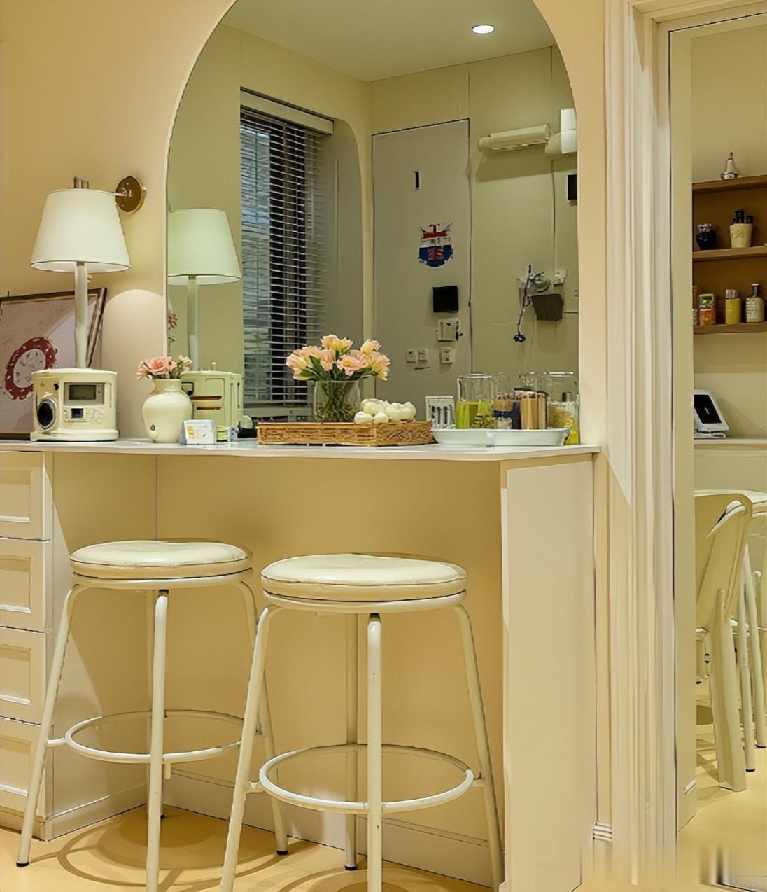 吧台高度设计在1.1米左右即可,这样平时两个人吃饭的话,其实刚好可以利用上这个吧台的区域,根本不需要餐桌。