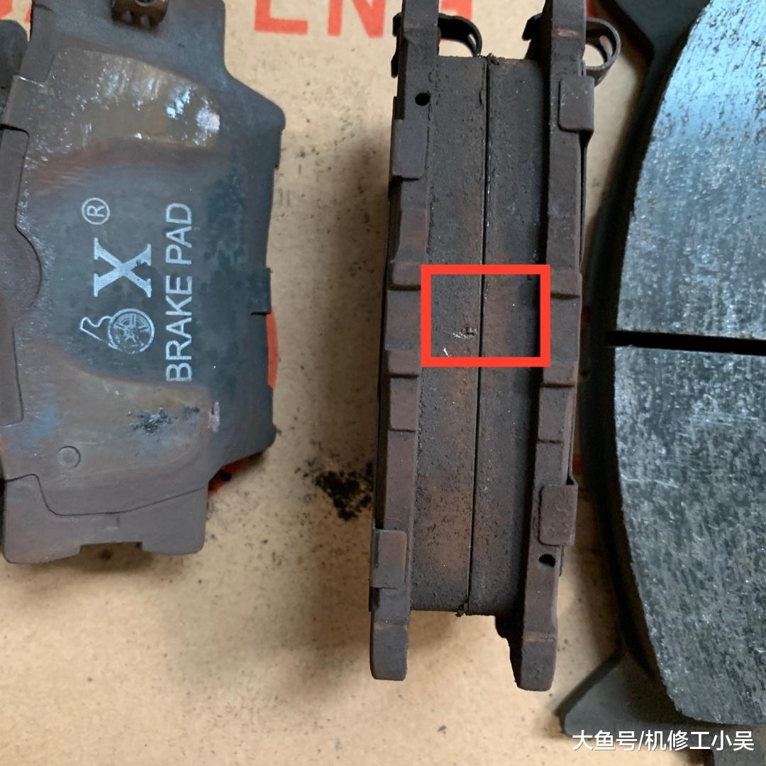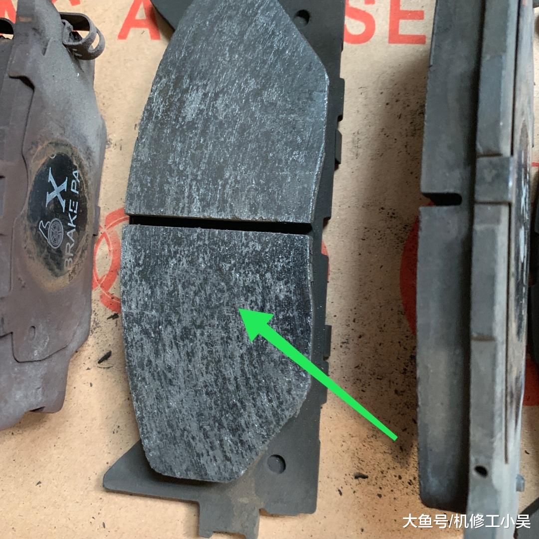 刹车片质量太差,硬度很大,只要踩刹车就有异响。这不仅会加速刹车盘的磨损,还会影响刹车性能,从图一和图二的摩擦面就可以看出来,解决办法就是:换刹车片。