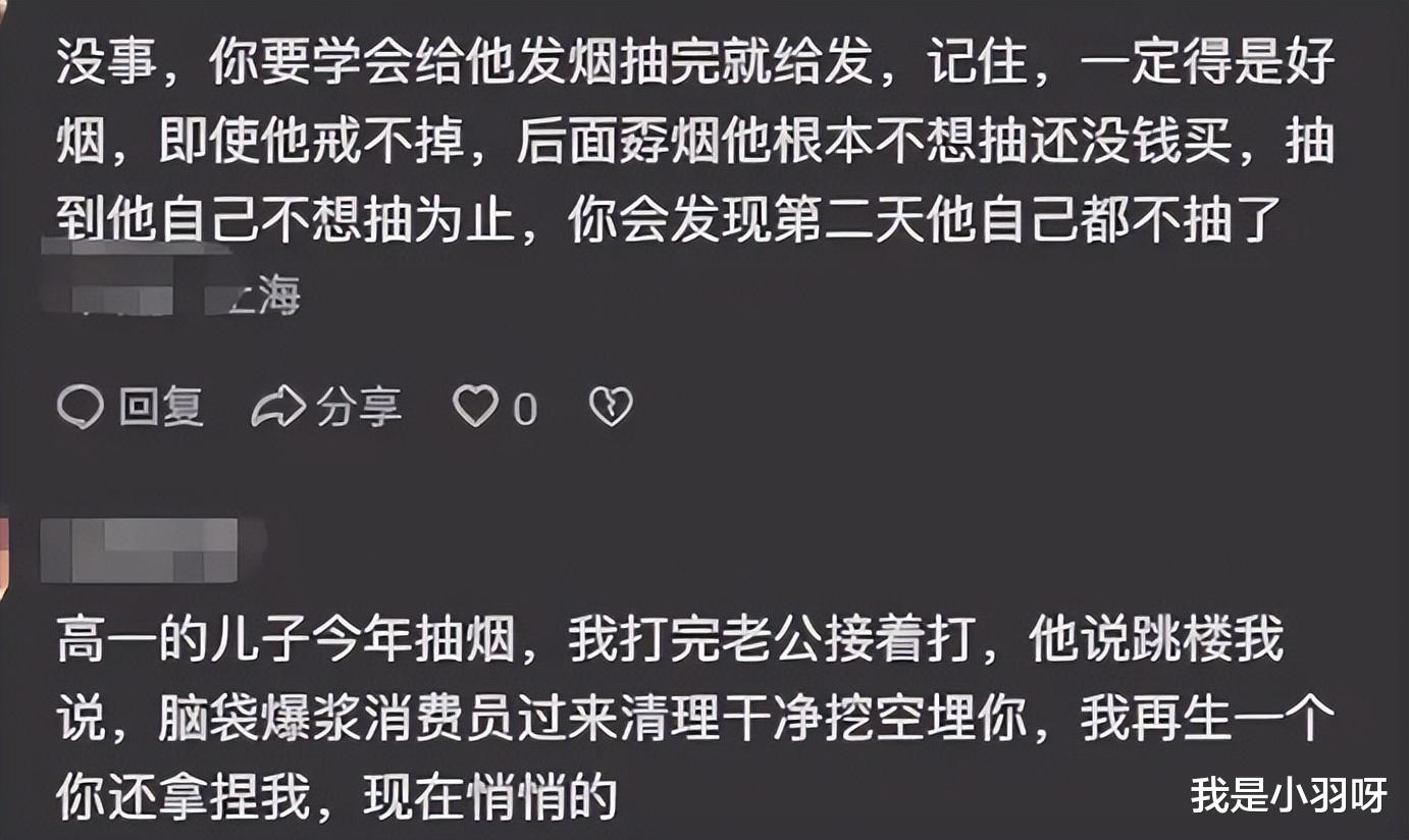 另一位家长分享了自己的“成功经验”:发现儿子吸烟后,夫妻二人直接混合双打,孩子闹着要跳楼,家长直截了当地表示“大不了我再生一个”,孩子听后反而偃旗息鼓,老老实实把烟戒了。