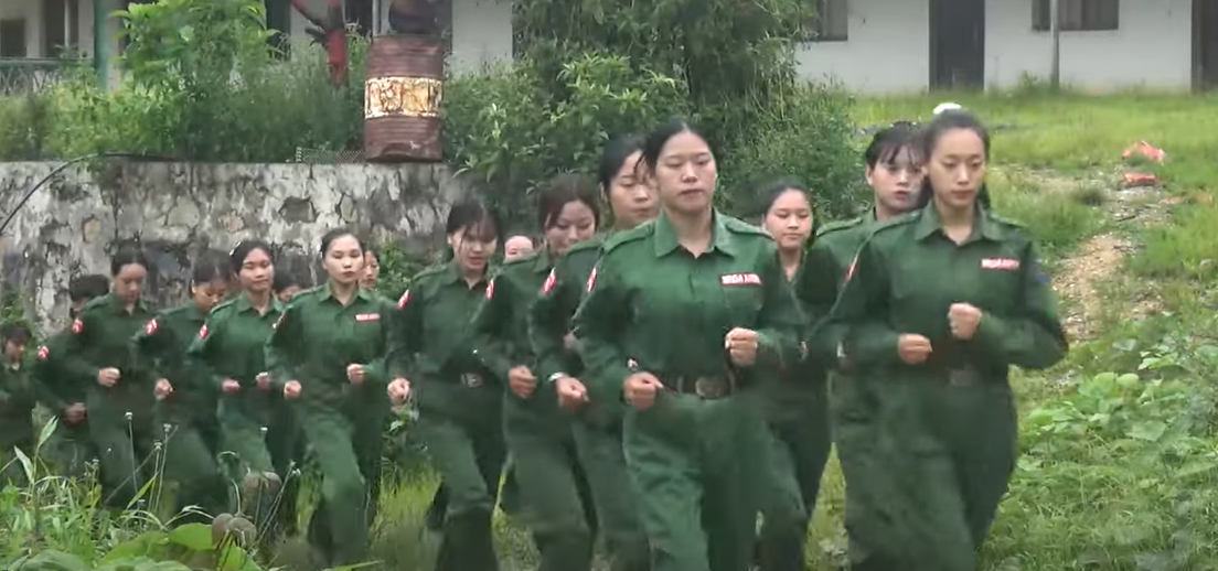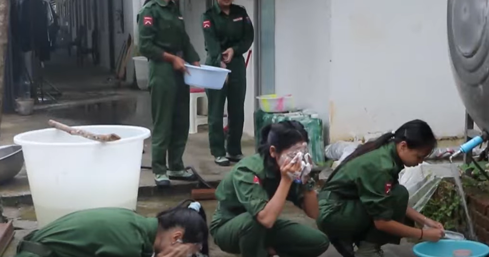 她们每天早上五点三十分,起床洗漱、整理内务、打扫卫生,开饭前要唱革命歌曲《我参加同盟军》,八点三十分,女兵们进入服装厂工作。