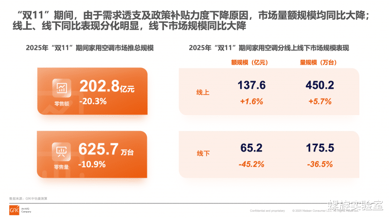 GfK中怡康数据显示,今年“双11”期间,冰箱、洗衣机、彩电等主要大家电品类的线下全渠道零售额,普遍同比下滑50%左右。