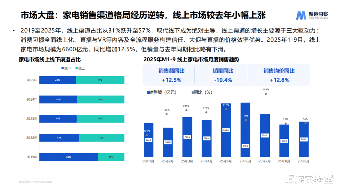 可是,跟冷清的线下卖场相比,家电线上渠道却依然火热。根据魔镜洞察数据,2025年前三季度,线上家电市场规模达6600亿元,同比增长12.5%。
