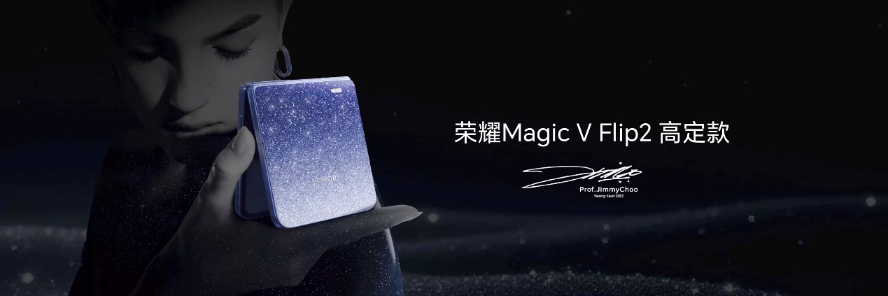 荣耀深谙时尚即个性表达的真谛,再度携手国际时尚大师Professor Jimmy Choo周仰杰博士,将宝石的三角形切面灵感融入手机设计,共同打造了荣耀Magic V Flip2高定款——织梦蓝。通过创新的双切火彩工艺,机身呈现出如高定水晶般流光溢彩的梦幻效果,镜头与轴盖处的钻石元素点缀更是将奢华感延伸至每处细节。