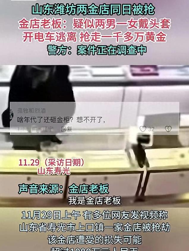 不过,近日山东潍坊寿光市、昌邑市一天内发生两起对金店的抢劫案,由于一个金店的老板称自己被抢走了大概一千万的金货,引发了广大网友的热议。并且由于一天内发生两起抢劫案,引发网友对这几个盗贼的兴趣,纷纷对此事关注起来。