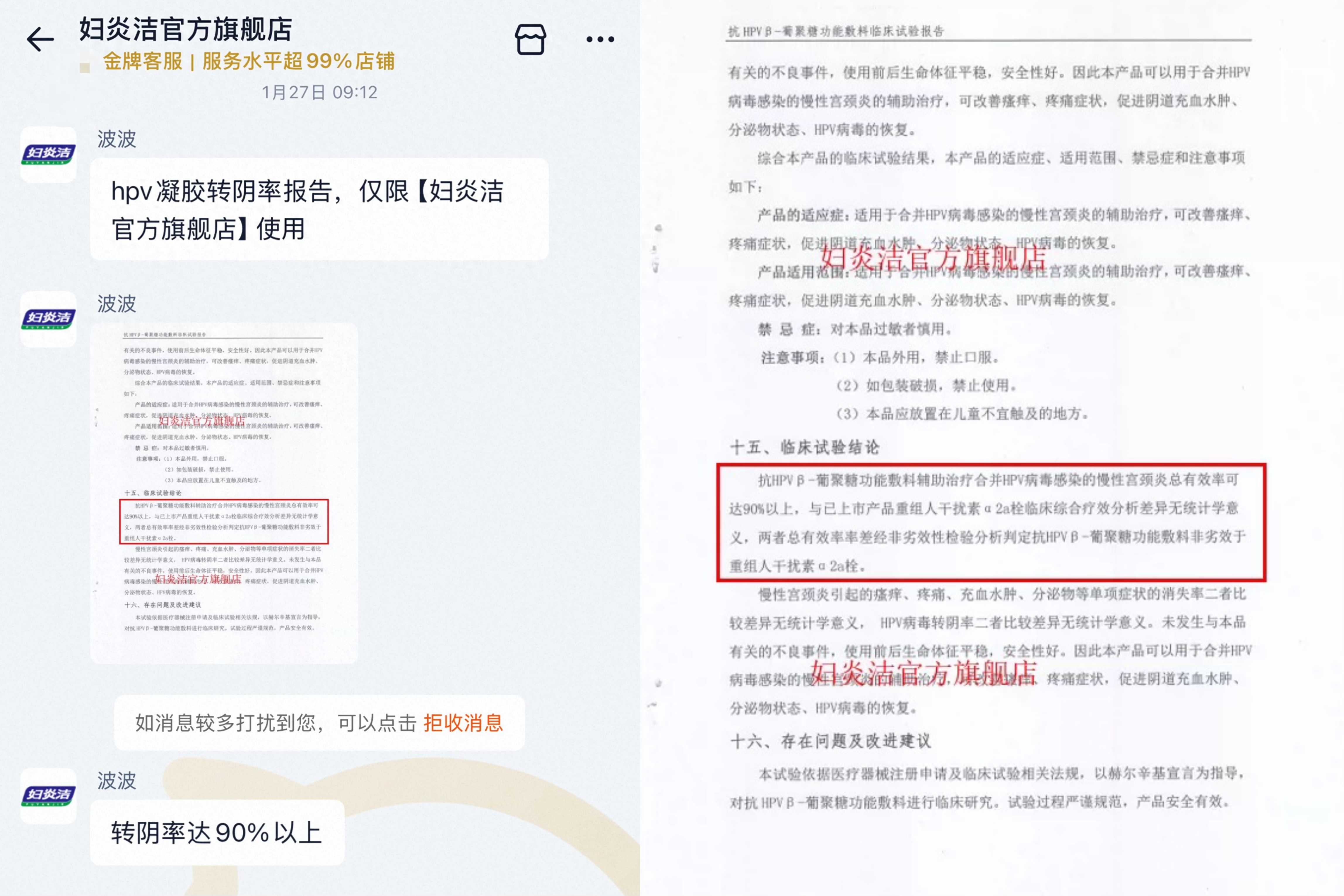 1月27日-29日,记者调查发现,电商平台上多款用于私处的抗HPV敷料凝胶类产品,以“转阴率”为噱头,夸大宣传产品功效;部分商家还承诺“不转阴退款”“免费续用”等,吸引消费者购买。这些产品的注册用途通常为降低病毒载量,以及改善相关症状,并未明确HPV病毒转阴功效;而商家提供的产品临床试验报告,也被客服解读为转阴率报告。