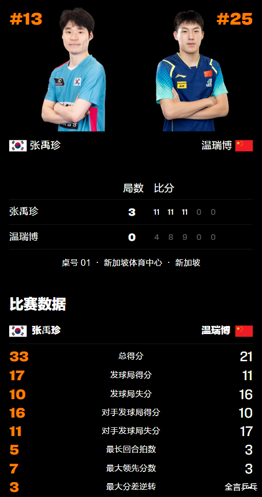 2026年2月22日,国乒在WTT新加坡大满贯赛上的首败诞生,19岁年轻新星温瑞博苦战后0-3被横扫,不敌韩国队头号主力张禹珍,由此而一轮游止步男单64强无缘冲击冠军,张禹珍也在1月单打战胜林诗栋、双打淘汰林诗栋/梁靖崑后再破国乒防线,的确有威胁!详细战况请看下文。